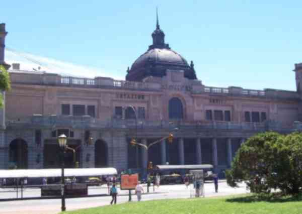 A few meters down Suipacha St. we find the Hispanoamerican Art Museum (Isaac Fernandez Blanco) with interesting collections of regional and colonial artifacts, like a collection of silver mates (mate tea gourds, etc.) and beautiful gardens. Across the street we catch a glimpse of exclusive modern high-rise bldgs. These are large flats (usually 6000 sq. ft.) coveted for their proximity to downtown and panoramic views on the river, and they have amenities like tennis courts and swimming pools we can peek as we walk. As we reach the level of Av. Libertador we can see the dome of the railroad station which was totally built in England and assembled here (across the street there's the entrance to the Railroad Museum.