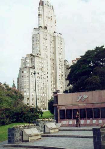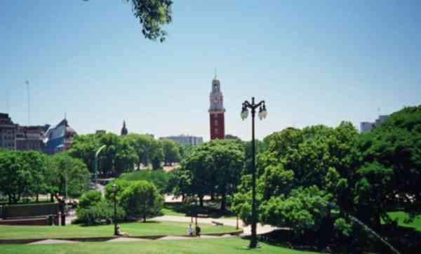 In Plaza San Martin you can see the city-wide slope that surronds the city. Here, it looks over the lower Retiro area (railroad stations, English tower, Canada park -with a genuine Canadian 27m high totem-, Sheraton Hotel, port area etc.). As a matter of fact that same slope can be seen in many other points as we visit the city. It is interesting to note that before the early 19th century this area was the slave depot, owned and operated by the French Compagnie de la Guinee first (1690) and later by the English Southern Seas Company until 1830. The whole area was marginal and frowned upon, and it wasn't till later in the 19th century that the rich families moved to this area to build their palaces, fleeing from the yellow fever epidemic outbursts that made them move out of the southern area (i.e. San Telmo) where they used to live.
